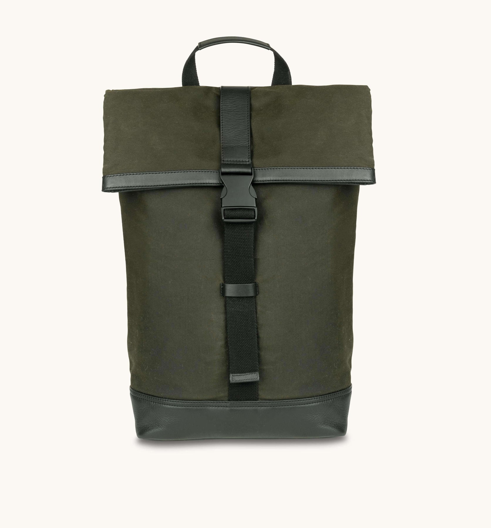Men's travel backpack made from a luxury waxed canvas with 100% leather trimmings.