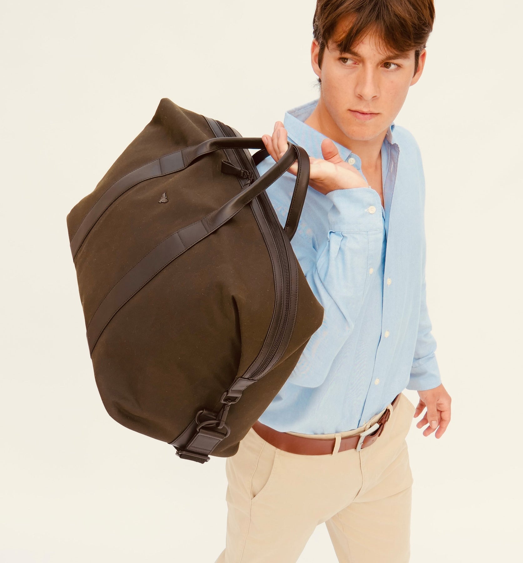 Men's weekend holdall travel bag made from a luxury waxed canvas with 100% leather trimmings.