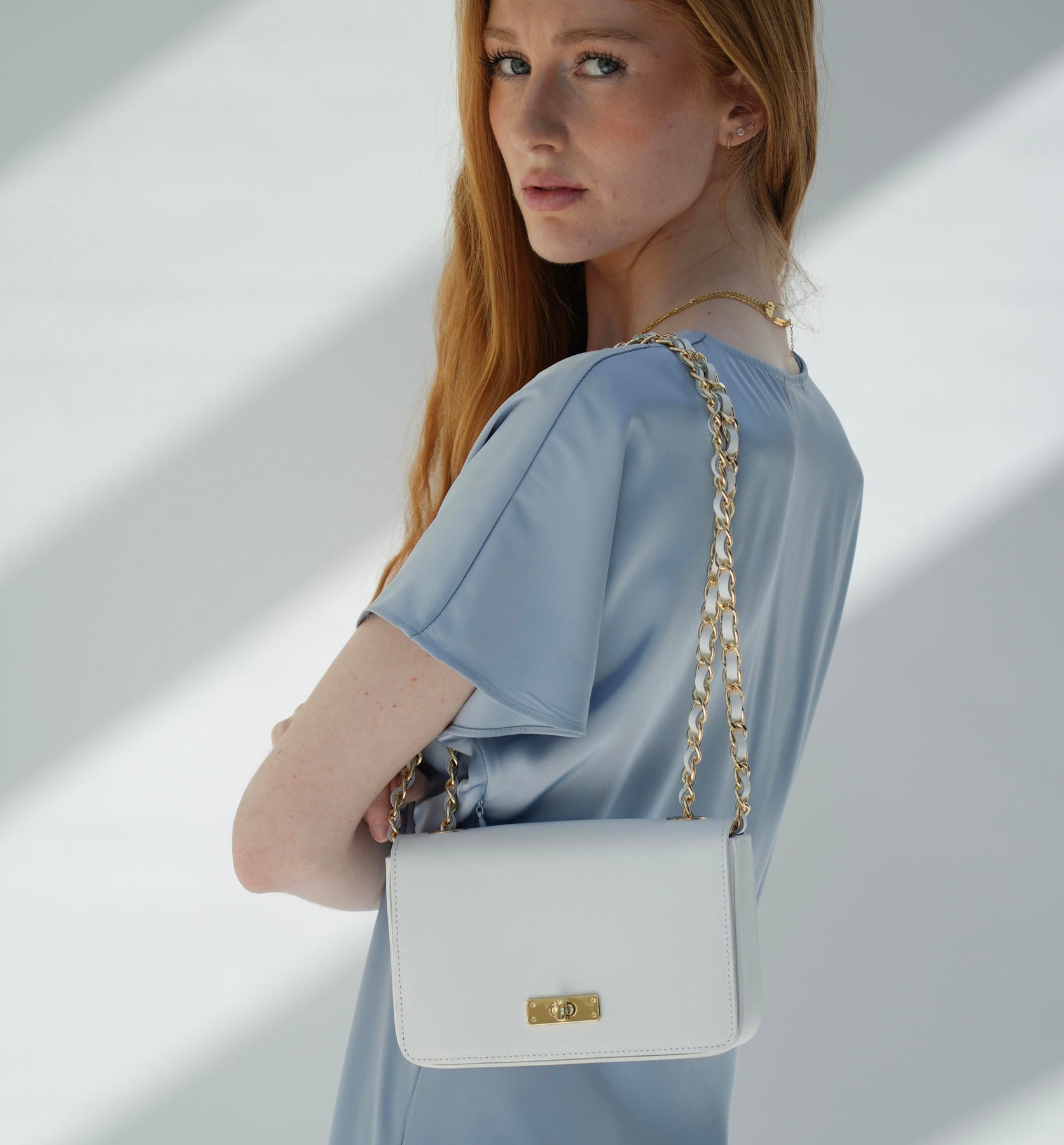 The Grace leather chain strap bag is made in Italy. 100% leather. Twist lock clasp.