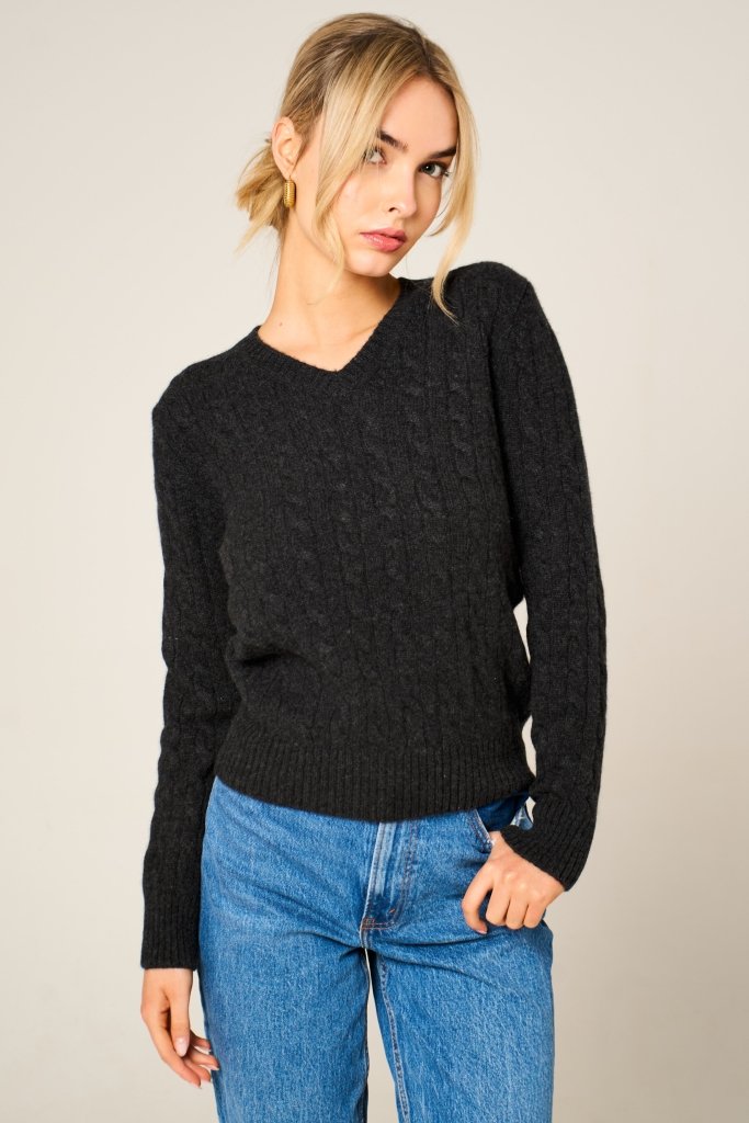 The classic cable knit pattern adds timeless texture and dimension, while the flattering V-neckline creates a graceful silhouette suitable for both relaxed and refined occasions. Lightweight yet luxuriously warm, this piece drapes beautifully, offering unparalleled softness against the skin.