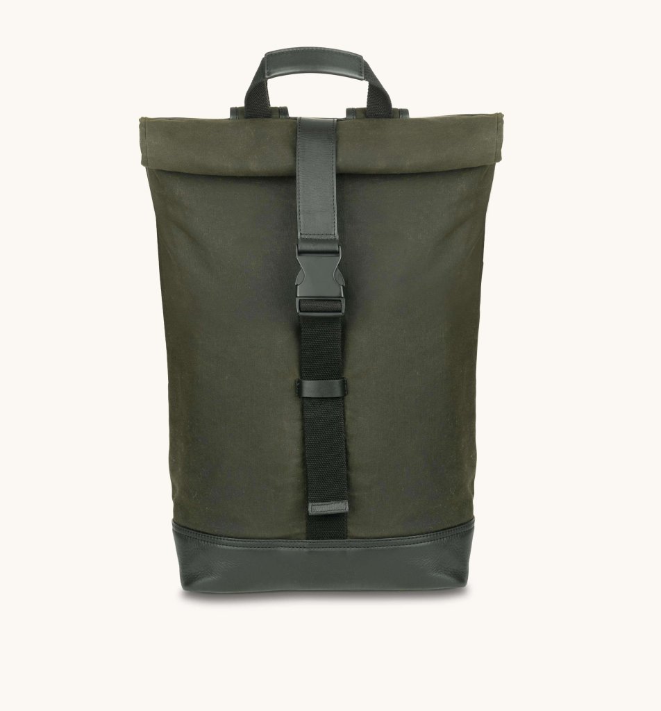Men's travel backpack made from a luxury waxed canvas with 100% leather trimmings.