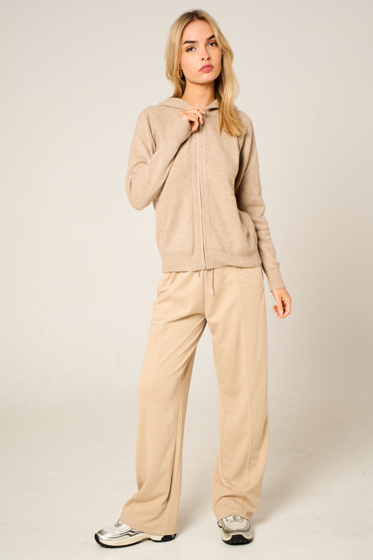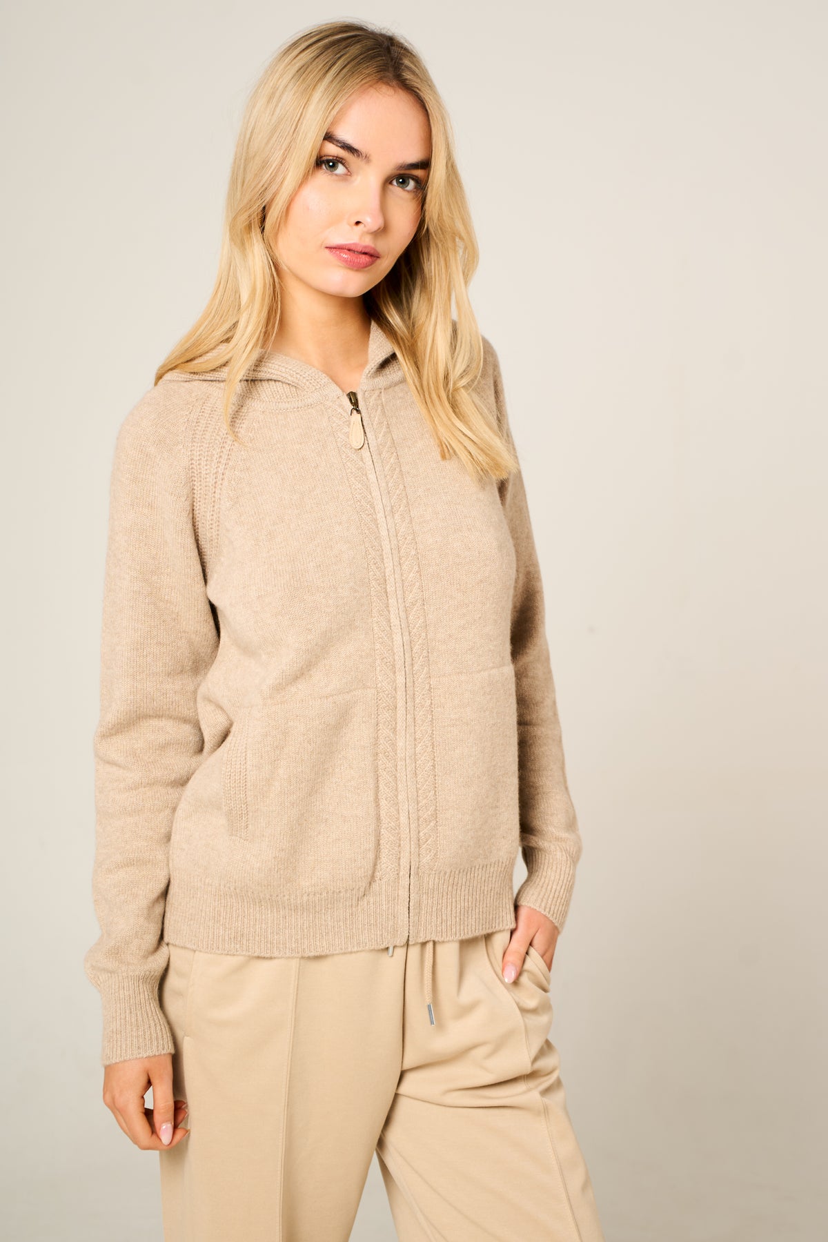 The soft hue evokes calm coastal charm, while the sumptuous cashmere texture provides unmatched warmth and comfort. A double zip closure, ribbed trims, and spacious front pockets combine practicality with refined detail — ideal for layering on cool days or travel comfort in style.